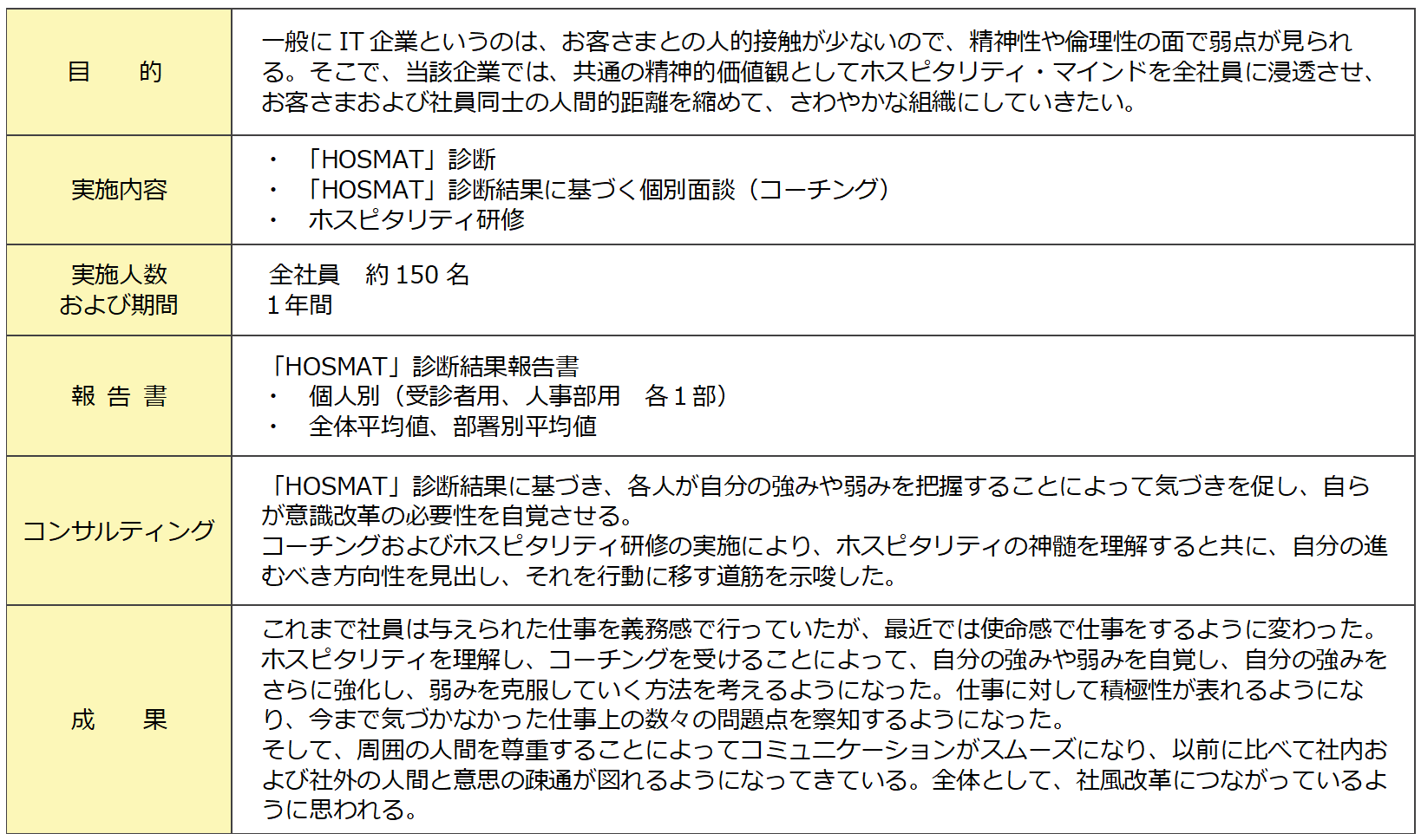 - 今までの診断テストは受診者の重箱の隅をつついたような人物評価であったが、「HOSMAT」はその人物の本質を捉えている。