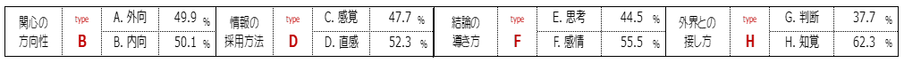 受診者の指向性について診断を行い、ユングの提案するタイプ論に基づいて受診者がどのタイプに属するかを明示します。